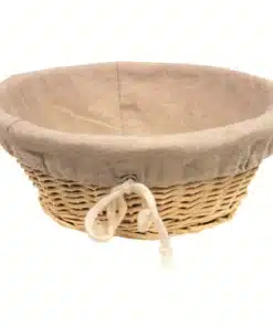 Corbeilles à pain on osier naturel avec tissu en toile de jute Ø25x9cm disponibles à la location pour vos évènements.
