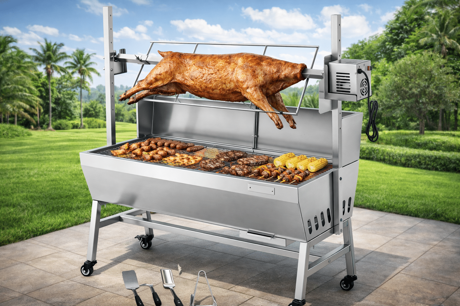 Nous vous proposons à la location ce barbecue rôtissoire d’extérieur, équipé d’un moteur de 38 W avec double roulement, assurant une rotation fluide à 360° à 3 tr/min. Un ventilateur de refroidissement amélioré ainsi qu’un pare-vent de protection permettent de maintenir une chaleur uniforme, garantissant une rotation stable et des grillades réussies en toute sérénité.
