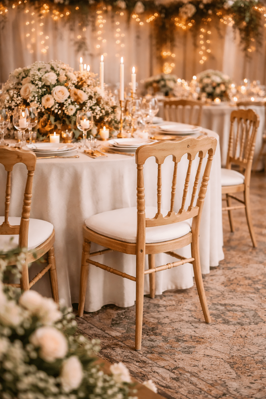 La chaise Napoléon en bois brut, reconnaissable par sa silhouette élégante et ses détails raffinés, est le choix idéal pour ceux qui souhaitent créer une ambiance à la fois classique et champêtre. De plus, son design intemporel assure une harmonie parfaite avec diverses décorations et thèmes.
